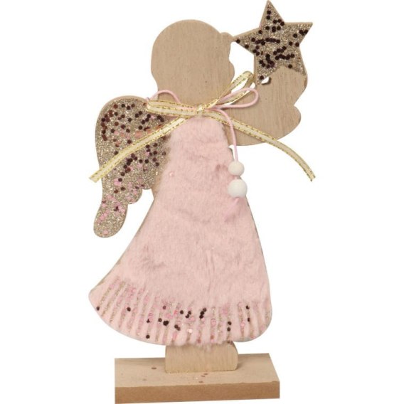 Aniołek - drewniana figurka ozdobiona różowym futerkiem i cekinami to subtelna dekoracja, która doda uroku każdemu wnętrzu. Stylowy i elegancki, świetnie sprawdzi się jako ozdoba na świąteczny stół, półkę czy komodę. Aniołek wykonany jest z drewna z dbałością o detale, dzięki czemu prezentuje się wyjątkowo i przyciąga wzrok. Wymiary figurki: 10 x 4,5 x 21 cm.