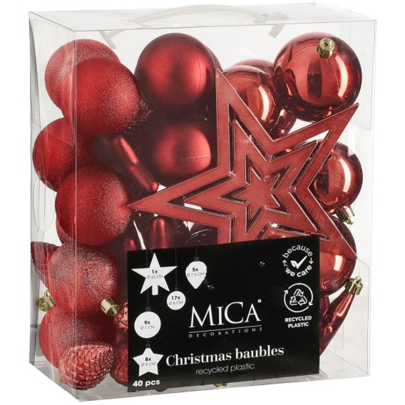 • W zestawie: - czubek gwiazda - 1szt, bombka/szyszka - 5szt/7,5cm, bombka o średnicy 6cm- 17szt., bombka o średnicy 8cm - 8szt., bombka o średnicy 7 cm - 9 szt., bombka gwiazdka o średnicy 8 cm -8szt.