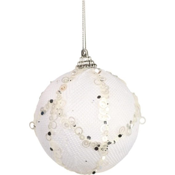 Biała bombka dekoracyjna ze srebrnym brokatem
