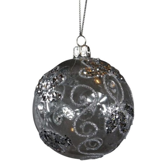 Bombka szklana bogato dekorowana brokatem i cekinami w kolorze srebrnym do ciemnej dekoracji, która doda blasku i elegancji znanem z aranżacjom. O 7 cm, ta piękna bombka nadaje się do zawieszenia na choince, w oknach lub jako stylowy element dekoracyjny na stole. Jej elementy dekoracyjne z brokatu i cekinów efektowną, błyszczącą światłem, które przyciąga i emanuje świątecznym klimatem.