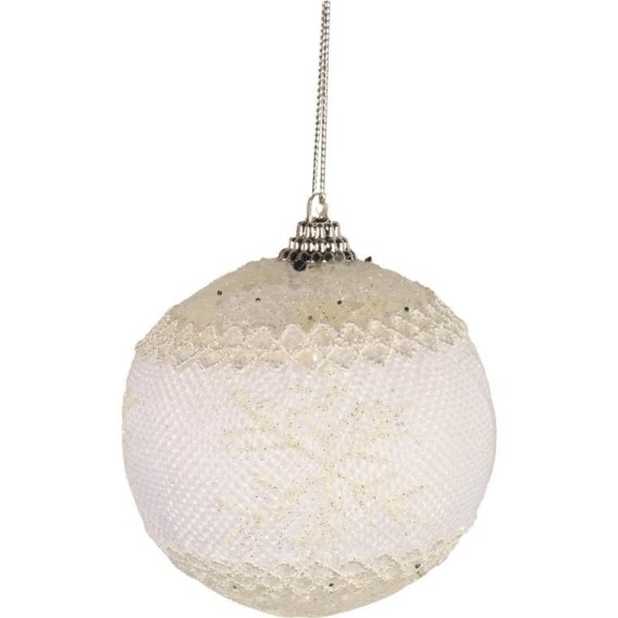 Niezwykle efektowna bombka styropianowa w kolorze biało-kremowym, ozdobiona koronkowym wzorem z delikatnym brokatowym połyskiem. Idealna jako elegancki akcent na świątecznej choince, nadaje dekoracji wyrafinowanego uroku i subtelnego blasku. Wielkość bombki: 8 cm.