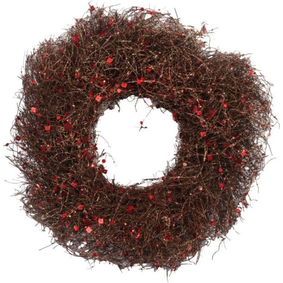 O wielkości 35 cm, ten stylowy wianek będzie idealnym akcentem na drzwiach, stołach czy ścianach, wprowadzając ciepło i przytulność do każdego wnętrza. Jego naturalny brązowy kolor w połączeniu z żywymi czerwonymi cekinami tworzy harmonijną kompozycję, która przyciąga wzrok i dodaje świątecznego blasku.