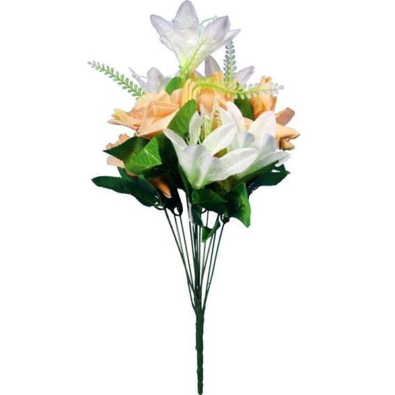 Bukiet 12 Sztucznych Kwiatów - Mix Róża z Lilią to elegancka kompozycja, która doskonale wpasuje się w każde wnętrze, dodając mu wyjątkowego uroku i świeżości. Bukiet w kolorze łososiowo-białym zachwyca swoją delikatnością i subtelnością, sprawiając, że stanie się piękną dekoracją zarówno w domu, jak i w biurze.
