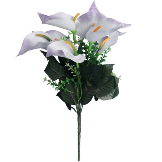 Kwiat sztuczny bukiet calli z bukszpanem o wysokości 37 cm w kolorze biało-fioletowym to dekoracja, która dzięki wysokiej jakości materiałom do złudzenia przypomina żywe kwiaty. Bukiet wprowadza do wnętrza elegancki i świeży akcent, nadając aranżacjom przytulny i stylowy charakter. Doskonale sprawdzi się jako samodzielna ozdoba w wazonie oraz jako element większych kompozycji florystycznych, bukietów, stroików i dekoracji okolicznościowych. Starannie wykonany zapewnia trwałość i realistyczny wygląd przez wiele sezonów, podkreślając wyjątkowy styl każdej przestrzeni. Bukiet calli z bukszpanem to praktyczne i efektowne rozwiązanie dla osób poszukujących dekoracji imitujących żywe rośliny, które nie wymagają pielęgnacji, idealny do domu, biura i przestrzeni komercyjnych.