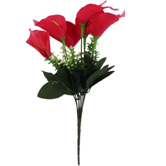 Kwiat sztuczny bukiet calli z bukszpanem o wysokości 37 cm w kolorze czerwonym to dekoracja, która dzięki wysokiej jakości materiałom do złudzenia przypomina żywe kwiaty. Bukiet wprowadza do wnętrza intensywny i elegancki akcent, nadając aranżacjom przytulny i stylowy charakter. Doskonale sprawdzi się jako samodzielna ozdoba w wazonie oraz jako element większych kompozycji florystycznych, bukietów, stroików i dekoracji okolicznościowych. Starannie wykonany zapewnia trwałość i realistyczny wygląd przez wiele sezonów, podkreślając wyjątkowy styl każdej przestrzeni. Bukiet calli z bukszpanem to praktyczne i efektowne rozwiązanie dla osób poszukujących dekoracji imitujących żywe rośliny, które nie wymagają pielęgnacji, idealny do domu, biura i przestrzeni komercyjnych