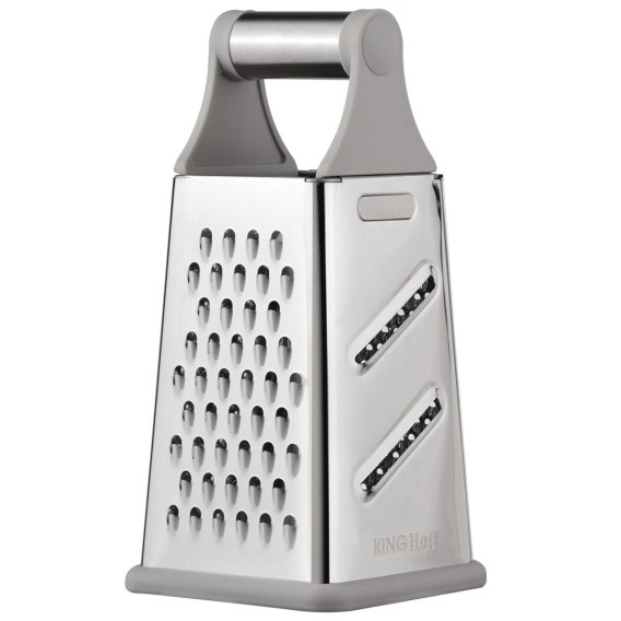 Uniwersalna tarka czterostronna KINGHoff to niezastąpione narzędzie w każdej kuchni. Dzięki czterem różnym powierzchniom tnącym z łatwością przygotujesz warzywa, owoce czy sery w idealnej formie. Solidne wykonanie i wygodny uchwyt zapewniają komfort pracy, a antypoślizgowa podstawa gwarantuje stabilność podczas użytkowania.