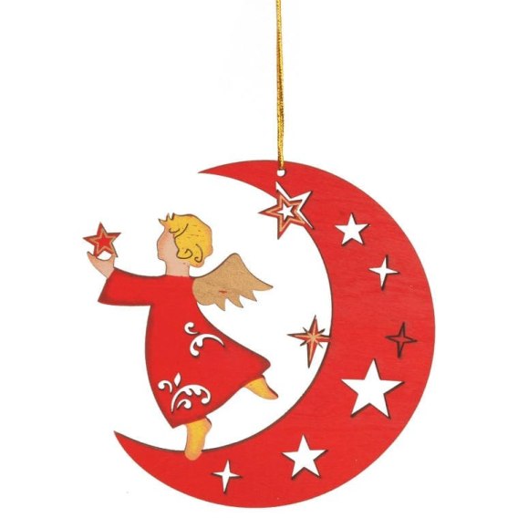 Czerwona Drewniana Zawieszka Świąteczna - Anioł na Księżycu