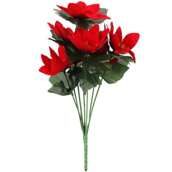 Sztuczny bukiet 7 poinsecji to elegancka dekoracja, która dzięki wysokiej jakości materiału wygląda jak żywy kwiat. Idealny jako samodzielny element ozdobny lub w większej kompozycji, doskonale uzupełni miejsca pamięci podczas świąt Bożego Narodzenia. Bukiet w intensywnym czerwonym kolorze wprowadza ciepło i radość do każdego wnętrza, tworząc świąteczny nastrój. Starannie wykonany z trwałych materiałów, zachowa swój urok przez wiele lat. O wysokości 32 cm, bukiet ten świetnie wpisuje się w różnorodne aranżacje świąteczne.