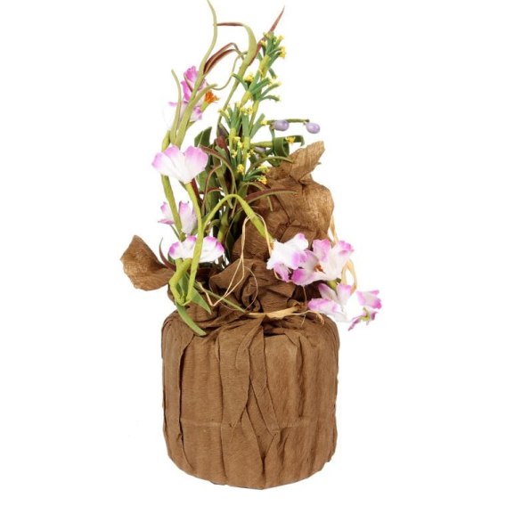 Kompozycja kwiatowa w eleganckiej papierowej doniczce to idealny element delikatnej dekoracji, który z łatwością można umieścić w dowolnym miejscu, dodając przestrzeni subtelności i naturalnego uroku. Ta stylowa ozdoba, utrzymana w harmonijnych brązowo-różowych barwach, doskonale wpasuje się w różnorodne aranżacje wnętrz, nadając im ciepłego i przytulnego charakteru. Dzięki swoim kompaktowym wymiarom 16x8 cm, jest perfekcyjnym wyborem na stół, półkę czy parapet, a także znakomitym pomysłem na wyjątkowy prezent, który wprowadzi odrobinę kwiecistej elegancji do każdego domu. To idealna dekoracja, która łączy estetykę z funkcjonalnością, podkreślając styl i harmonię otoczenia.