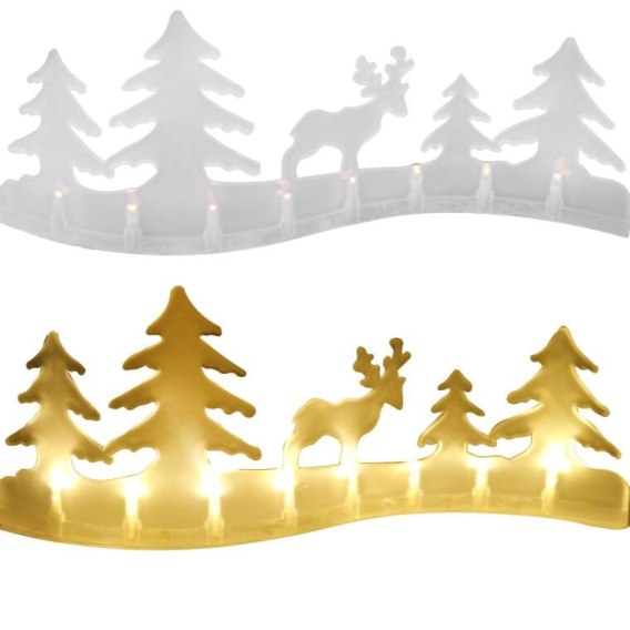 Dekoracja Świetlna 8 LED na Baterie do Postawienia to elegancka i efektowna ozdoba, która doda świątecznego klimatu każdemu wnętrzu. Wykonana z wysokiej jakości plastiku, ta urokliwa dekoracja przedstawia falowany płotek, na którym znajdują się choinki oraz urocza figurka renifera. Osiem ciepłych białych diod LED emituje przyjemne światło, tworząc romantyczną atmosferę i rozświetlając przestrzeń w wyjątkowy sposób.