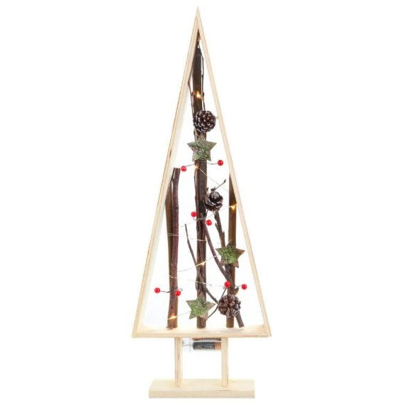 Stojąca drewniana choinka w kształcie trójkąta to elegancka dekoracja, która doda wyjątkowego uroku Twojemu wnętrzu. Wyposażona w 10 lamp LED, ta choinka zasilana na dwie baterie typu paluszki zapewnia delikatne, ciepłe oświetlenie, które wprowadza przytulną atmosferę. Jej prosta forma została ozdobiona naturalnymi gałęziami, szyszkami oraz jarzębiną, co sprawia, że idealnie wpisuje się w świąteczny klimat. Dzięki wymiarom 56x20x6 cm, doskonale nadaje się do postawienia na stole, komodzie czy oknie, tworząc piękną ozdobę, która zachwyci każdego.