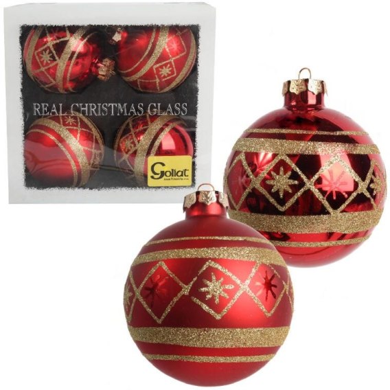 Elegancki Zestaw 4 Czerwonych, Dekorowanych Bombek Szklanych o Wielkości 10 cm