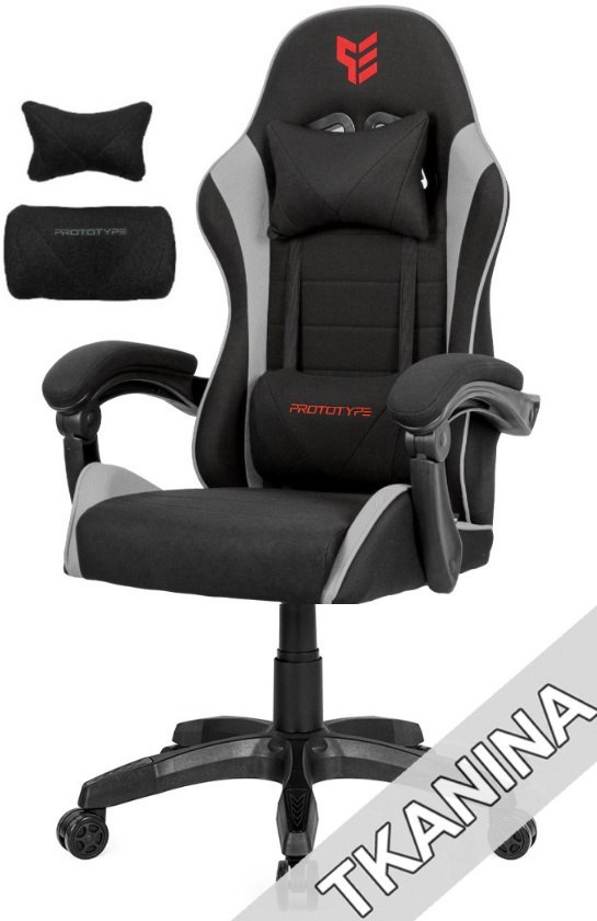 Fotel obrotowy, gamingowy marki Prototype z odchylanym oparciem, blokadą MPS i niezależną funkcją regulacji wysokości oparcia. Tapicerowany wytrzymałą tkaniną.
