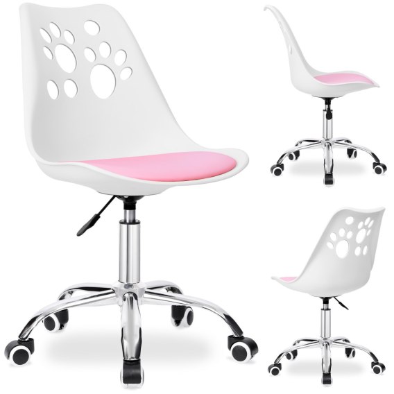 Fotel dziecięcy Grover  to solidny fotel biurowy z płynną regulacją wysokości. Wykonany z wytrzymałego tworzywa PP, ekoskóry i stelaża wykończonego na chromowany kolor. Krzesło biurowe Grover charakteryzuje się wyprofilowanym, ergonomicznym siedziskiem z miękką wygodną poduszką z ekoskóry. Oparcie zdobi ciekawy wzór w kocie łapki. Fotel jest wygodny i komfortowy w użytkowaniu. Jest stabilny, w pełni obrotowy i cichy dzięki gumowym kółkom. Ciekawe wzornictwo i pastelowe kolory świetnie wpasują się w każdy pokój dziecięcy. Kupując u nas, kupujesz od bezpośredniego producenta!