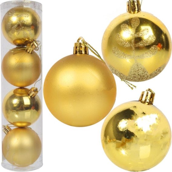 Zestaw czterech bombek plastikowych w tubie w kolorze złotym to elegancka dekoracja świąteczna, która doda blasku i stylu każdemu wnętrzu. W skład zestawu wchodzą dwie matowe bombki, jedna połyskowa oraz jedna ozdobiona dekoracyjnym detalem, co sprawia, że idealnie komponują się w różnych aranżacjach. Te efektowne zawieszki świetnie sprawdzą się na choince, w girlandach oraz w stroikach, wprowadzając natychmiastowy, ekskluzywny klimat do Twojego otoczenia. Wykonane z trwałego plastiku, są lekkie i łatwe w zawieszaniu, a ich wielkość 6 cm czyni je uniwersalnym dodatkiem do świątecznych dekoracji. Zapakowane w elegancki box PVC, te bombki stanowią doskonały wybór na wyjątkowe święta!