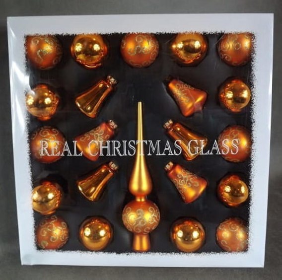 Komplet 21 Pomarańczowych Bombek Szklanych z Dekoracją: 15 Bombek, 4 Dzwonki i Czubek