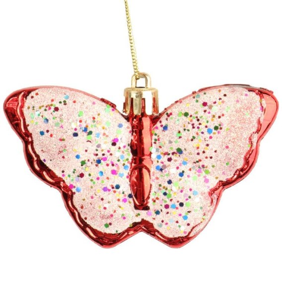 Komplet czterech plastikowych bombek w kształcie motyli w żywym czerwonym kolorze, o wielkości 7 cm. Te efektowne ozdoby doskonale sprawdzą się jako wyjątkowy akcent na choince, wprowadzając radosny i oryginalny element do świątecznej dekoracji.