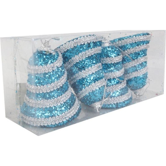 Komplet 4 dzwonków cekinowych niebiesko srebrnych 7 cm