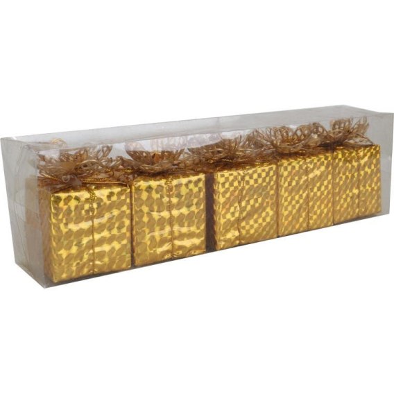 Komplet 5 złotych zawieszek w kształcie paczuszek to elegancki dodatek, który doda blasku Twoim świątecznym dekoracjom. Zapakowane w przezroczysty boks PVC, zawieszki te idealnie nadają się do ozdabiania choinki, prezentów czy innych miejsc w Twoim domu, tworząc przytulną atmosferę.