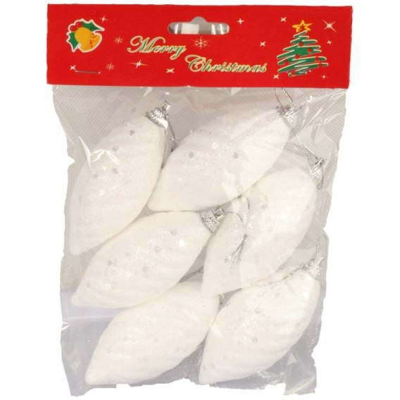 Komplet 6 Białych Bombek Styropianowych w Kształcie Szyszek z Brokatem, 9 cm