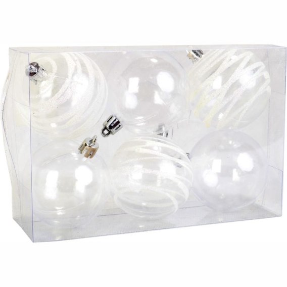 Komplet 6 Przeźroczystych Bombek Plastikowych z Dekorem, Kolor Biały, 6 cm