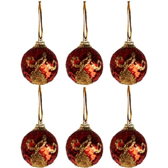 Komplet sześciu brokatowych bombek w kolorze czerwono-złotym to znakomita dekoracja, która doda blasku i świątecznego klimatu każdej choinkowej aranżacji. O wielkości 6 cm, te efektowne bombki doskonale łączą elegancję z radością, tworząc niezapomniane akcenty w Twoim domu.