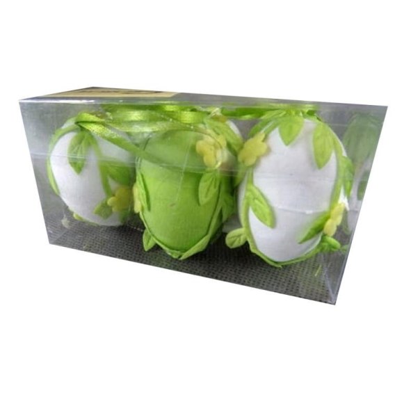 Komplet 6 jajek z naklejonymi materiałowymi motywami kwiatów i liści w kolorze zielonym