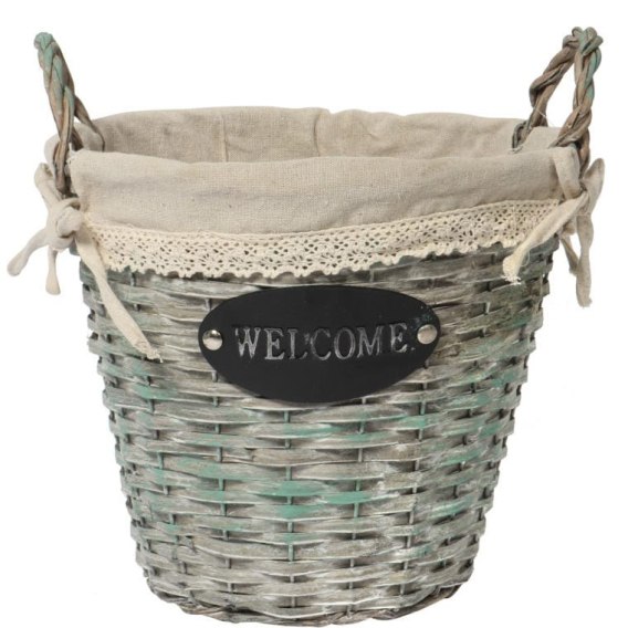 Koszyk Wiklinowy z Uchwytami, Wkładem Lnianym i Dekoracyjnym Napisem WELCOME Szary