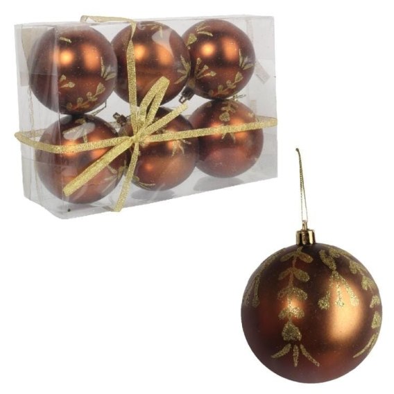 Kpl. 6 bombek plastikowych z dekorem 8 cm brązowe