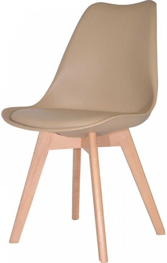 Nowoczesne krzesło skandynawskie do kuchni, jadalni, salonu lub gabinetu w kolorze beżowym, z miękką poduszką wykonaną z ekoskóry.