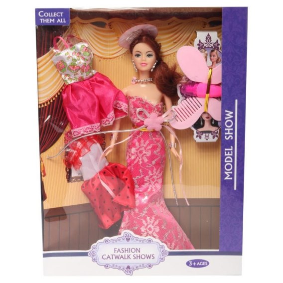 Lalka w różowej sukience i niebieskim kapeluszu w zestawie