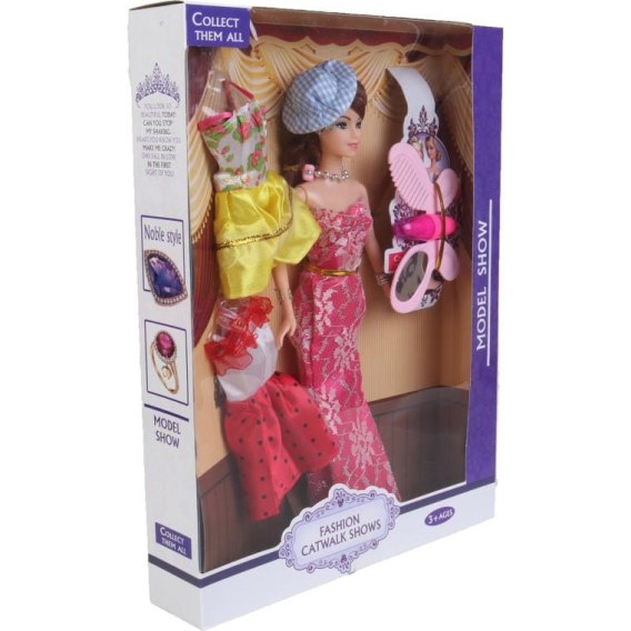 Lalka w różowej sukience i różowym kapeluszu w zestawie