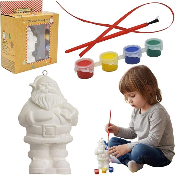 - zestaw zawiera Mikołaja z gipsu do samodzielnego pomalowania, 4 farbki, pędzel i wstążkę