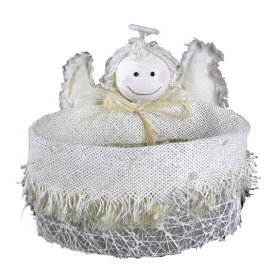 Koszyk z wielkością z aniołem w kolorze białym to piękna dekoracja, która doda elegancji i magicznego wnętrza. O wymiarach 20 x 21 cm, dziesięć uroczych koszyków sprawdziło się jako dekoracja stołu, komody czy parapetu, wprowadzając świąteczną atmosferę do każdego pomieszczenia.