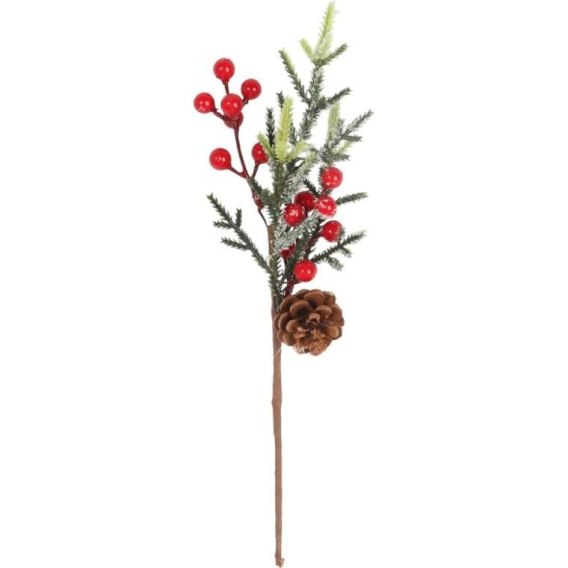 PIK GAŁĄZKA ozdobna z JARZĘBINĄ I SZYSZKĄ OŚNIEŻONA 34 CM czerwona