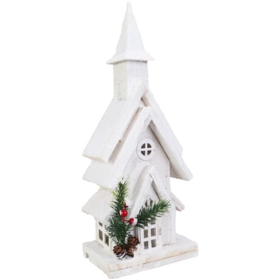 Podświetlana Dekoracja Świąteczna - Ośnieżony Kościółek z LED, Wymiary 38 cm, Kolor Biały, Zasilanie Bateryjne