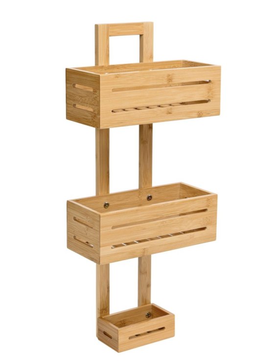 Dzięki wiszącej półce MANILA wykonanej z bambusa stworzysz przestrzeń do przechowywania w swojej łazience. Półka prysznicowa posiada łącznie 3 kosze. Dwie górne mają miejsce na szampon, żel pod prysznic i inne większe butelki. Dolna komora jest mniejsza i nadaje się na mydło lub maszynki do golenia.