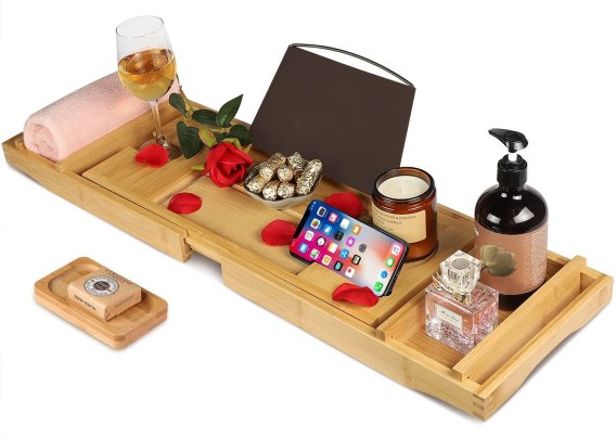 Praktyczny organizer na wannę posiada dwie zdejmowane półki do przechowywania produktów do kąpieli oraz mydelniczkę, dzięki czemu możesz mieć wszystko, czego potrzebujesz do mycia włosów i ciała w zasięgu ręki! Dodaliśmy nawet uchwyt na kubek z Twoją ulubioną herbatą czy szklanką wody do ochłodzenia w ciepłej odprężającej kąpieli. A możesz umieścić w nim świeczkę podczas romantycznej kąpieli.