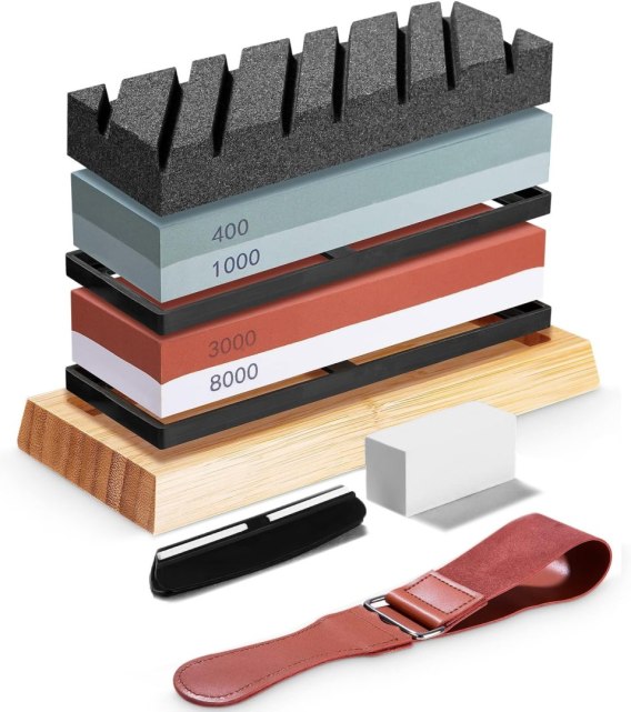 W zestawie: dwa kamienie z korundu, skórzany pasek, kamień naprawczy, prowadnica do utrzymywania kąta, bambusowa podstawka oraz kamień spłaszczający osełkę