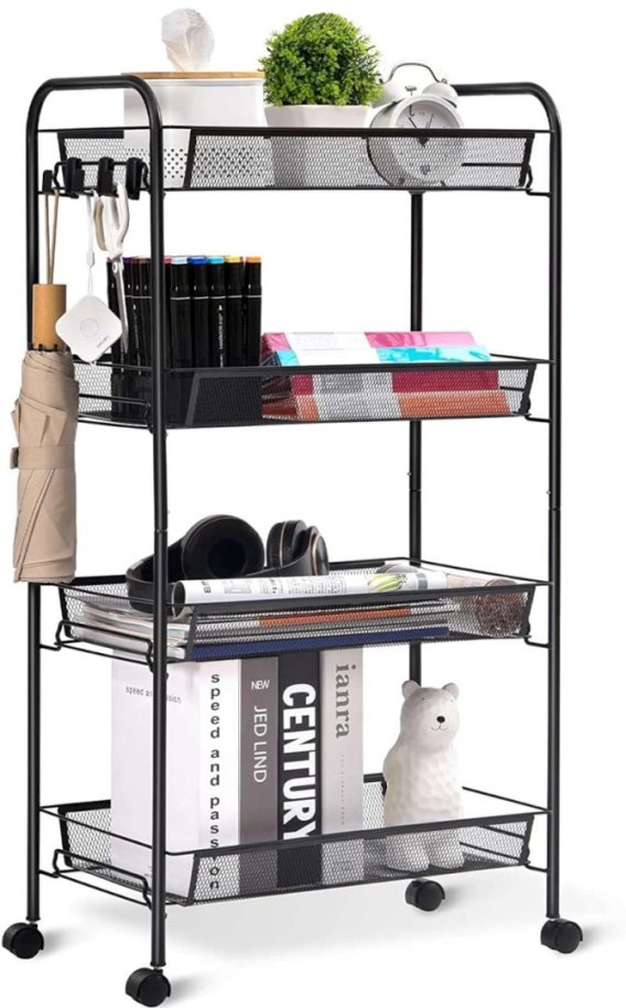 Olden to wielozadaniowy regał, który sprawdzi się w każdych warunkach. Idealny do kuchni, łazienki, salonu czy sypialni. Jego przemyślana konstrukcja pozwala zagospodarować wąskie przestrzenie i ułatwia dostęp do najpotrzebniejszych rzeczy. Model wyposażony w 4 półki, które z pewnością pomieszczą mnóstwo niezbędnych akcesoriów. Regał ma 4 kółka, w tym 2 posiadające blokadę z hamulcem. W zestawie 4 haczyki do zawieszania np. ścierek kuchennych. Można je montować po lewej i po prawej stronie na każdym poziomie wg uznania. Olden wykonany jest z materiałów najwyższej jakości. Konstrukcja ze stali malowanej proszkowo na czarny błyszczący kolor.