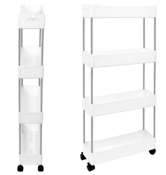 Przestronność: Cztery pojemne półki pozwalają na uporządkowane przechowywanie różnorodnych przedmiotów, od kuchennych akcesoriów po kosmetyki i ręczniki.