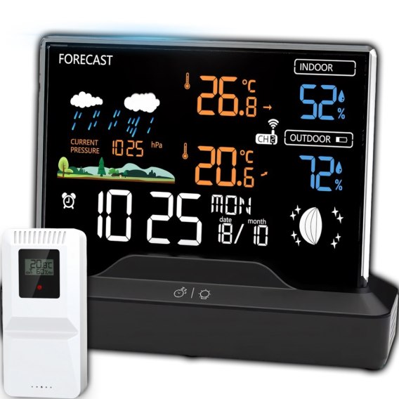 Stacja pogodowa Retoo ER1228-1 to nowoczesne i funkcjonalne urządzenie do monitorowania warunków atmosferycznych w domu i na zewnątrz. Wyposażona w bezprzewodowy czujnik zewnętrzny, stacja umożliwia dokładny pomiar temperatury, wilgotności, ciśnienia oraz prognozę pogody. Duży, czytelny ekran LCD prezentuje również fazy księżyca, datę, godzinę oraz umożliwia ustawienie budzika. Synchronizacja radiowa czasu (DCF) zapewnia precyzyjne wskazania. Urządzenie posiada pamięć pomiarów oraz możliwość rozbudowy o dodatkowe czujniki.