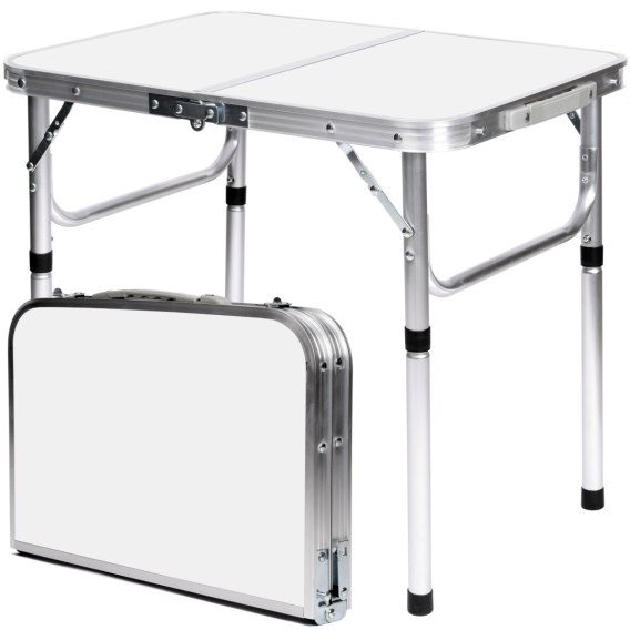 Stelaż z lekkiego i trwałego aluminium zapewnia stabilność, a blat z płyty MDF powlekanej laminatem jest trwały. Stolik posiada również blokady przeciwko niekontrolowanemu złożeniu się oraz wygodną rączkę do przenoszenia.