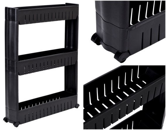 Doskonała do każdego wąskiego pomieszczenia mobilna szafka z trzema półkami. Konstrukcja modułowa wykonana z wytrzymałego tworzywa, pozwala na dodawanie lub odejmowanie półek. Kompaktowe wymiary sprawiają, że idealnie wpasuje się w wąskie przestrzenie pomiędzy szafką, a lodówką albo pralką. Trzy pojemne półki pozwolą na przechowywanie potrzebnych pod ręką niezbędnych akcesoriów np. przyprawy i akcesoria kuchenne, czy kosmetyki, akcesoria łazienkowe i środki czystości. Dzięki wyposażeniu w 4 kółka regał jest bardzo mobilny i w łatwy sposób można go przesuwać.