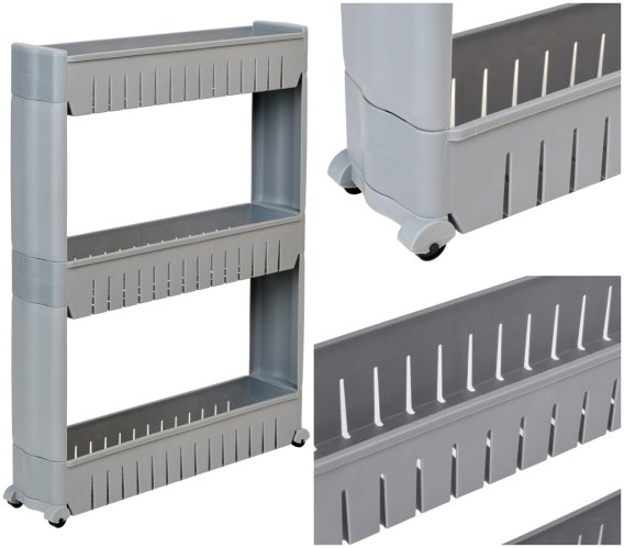Dzięki wykorzystaniu mobilnej półki można zyskać dodatkową przestrzeń w wąskim miejscu np.: pomiędzy lodówką a szafką czy pralką a ścianą. Trzy pojemne półki ułatwią przechowywanie wielu rzeczy.