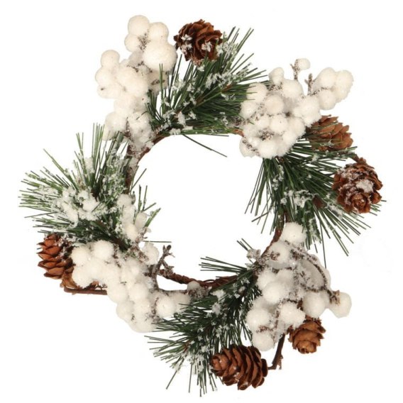 Wianek ośnieżony z białymi kulkami i szyszkami 13 cm.