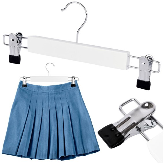Aktualne trendy sprawiły, że na nowo do łask powróciła moda na długie spódnice. By się nie gniotły, należy je odpowiednio przechowywać. W tym celu zaprojektowano wieszak drewniany z klipsami. Estetycznie wykonany z litego drewna, trwały i wytrzymały. Lakierowany i wykończony na biały kolor. Model posiada klipsy z możliwością regulacji ich rozstawu. Klipsy posiadają silikonowe końcówki, co sprawia, że są bezpieczne nawet dla delikatnych ubrań. Mocno trzymają odzież i zapobiegają zsuwaniu się jej z wieszaka. Wieszak posiada w pełni obrotowy stalowy chromowany haczyk, który ułatwia zawieszanie i zdejmowanie ubrań. Wieszak z klipsami to doskonałe rozwiązanie do przechowywania odzieży. Jest praktyczny i uniwersalny. Dzięki niemu nie tylko odpowiednio przechowasz spodnie czy spódnice, ale i zaoszczędzisz sporo wolnego miejsca w garderobie. Wieszak w białym kolorze świetnie sprawdzi się w garderobach i wnętrzach urządzonych w stylach skandynawskim i klasycznym.