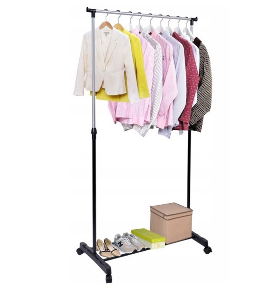Wieszak sprawdzi się w każdym domu i w biurze, w którym brakuje miejsca do powieszenia odzieży. Nasz produkt został wyposażony w pojedynczy drążek, którego wysokość można łatwo regulować za pomocą nakrętek oraz kółka umożliwiające wygodne przemieszczanie. Dodatkowym atutem wieszaka jest wytrzymała i zaskakująco pojemna półka na buty, oraz nakładki na końce drążka uniemożliwiające zsunięcie się odzieży. Montaż wieszaka jest niezwykle prosty i nie wymaga użycia narzędzi. Wytrzymała konstrukcja z metalowych rurek w obejmach z tworzywa sztucznego, drążek z zabezpieczeniem przed zsunięciem się wieszaka.