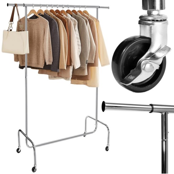 Wieszak wyposażony jest w cztery solidne kółka, co znacznie ułatwia jego przemieszczanie. Dwa z tych kółek są wyposażone w hamulce, co zapewnia dodatkowe bezpieczeństwo i stabilność, kiedy wieszak stoi w wybranym miejscu. Kółka te są zaprojektowane tak, aby być wytrzymałe i łatwe w manewrowaniu, nawet pod ciężarem pełno zawieszonej odzieży. Hamulce działają intuicyjnie i są proste w obsłudze - wystarczy nacisnąć lub podnieść małą dźwignię umieszczoną na kółku, aby zablokować lub odblokować wieszak.