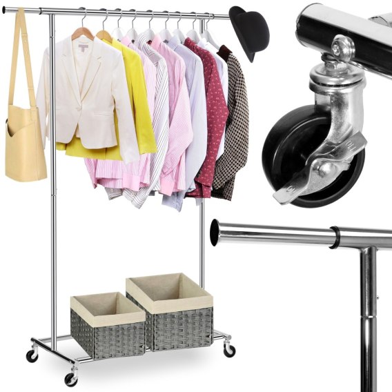 Wieszak Tahir to praktyczny i funkcjonalny wieszak stojący na kółkach wykonany ze stali chromowanej, z zachowaniem dbałości o najmniejsze detale. Dzięki swoim kółkom wieszak jest mobilny i łatwo przemieszcza się po pomieszczeniu, co pozwala na swobodne zmienianie jego położenia w zależności od potrzeb. Jedna para kółek posiada wbudowane hamulce. Cechą wyróżniającą wieszak Tahir jest jego zwiększona odporność i wytrzymałość, dzięki czemu jego maksymalne równomierne obciążenie wynosi nawet 90 kg. Bez problemu i bez obaw o jego stabilność można powiesić na nim wiele ubrań, oszczędzając przy tym miejsce w szafie lub garderobie. Na dolnym poziomie z łatwością pomieścimy pudełka na akcesoria, czy kilka par butów. Boczne ramiona wieszaka można regulować w zakresie do ok. 20 cm. Pozwala to rozszerzyć wieszak łącznie na 132 cm szerokości. Tahir to również doskonała propozycja dla osób, które cenią sobie nie tylko wygodę, ale także elegancki wygląd swojego domu czy biura. Model ma prostą konstrukcję i klasyczny design pozwalający na łatwe dopasowanie wieszaka do każdego wnętrza, bez względu na jego styl czy kolorystykę.